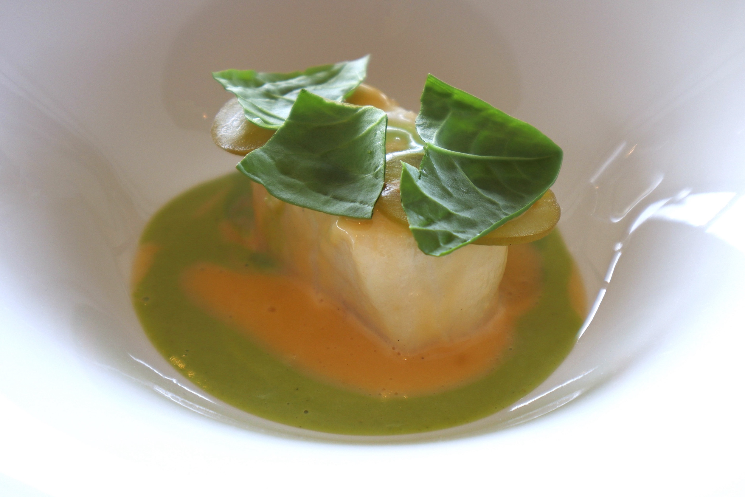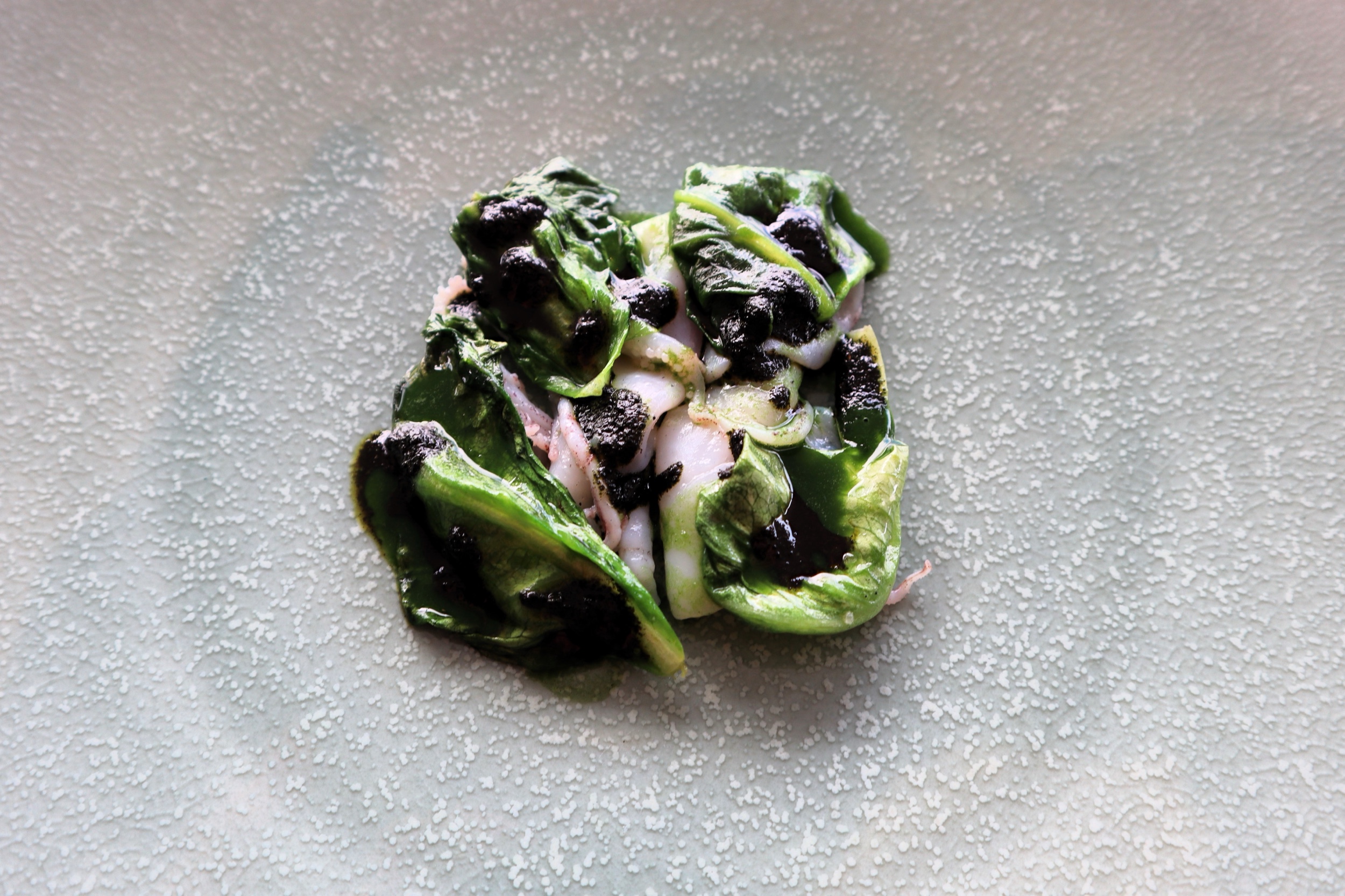Saltimbocca di lattuga di mare, spigola e ricciola, misticanza e gel di limone, salsa alla salvia. Un grande lavoro sulla stratificazione dei gusti, ingredienti e consistenze, dove la croccantezza della lattuga in tempura si scontra con la delicatezza del pesce, la freschezza della misticanza e l’aromaticità della salvia