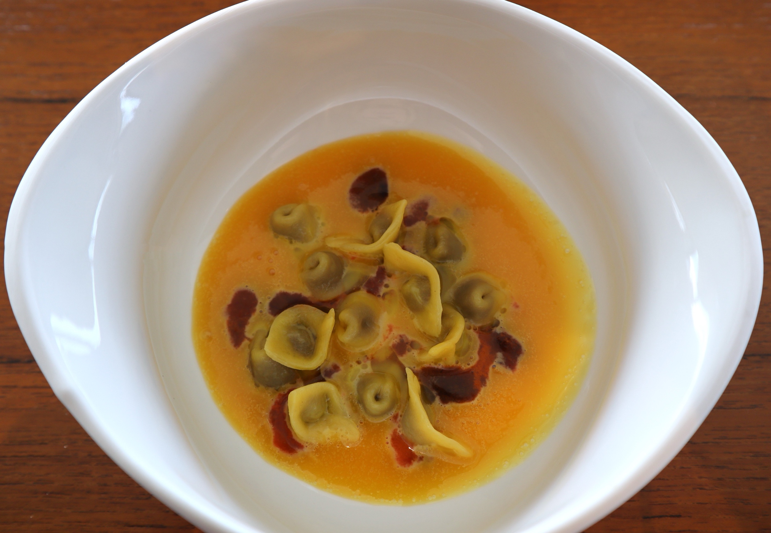 Cappelletti di olive amare, burro all’arancia e ricci di mare. Conquistano per un ripieno super intenso e l’abbinamento alla dolcezza del burro d’arancia e alla sapidità dei ricci di mare straordinario. Drink a base di bitter di Baldo Baldinini, acqua tonica mediterranea, acqua di mare e agrumi, perfetto.