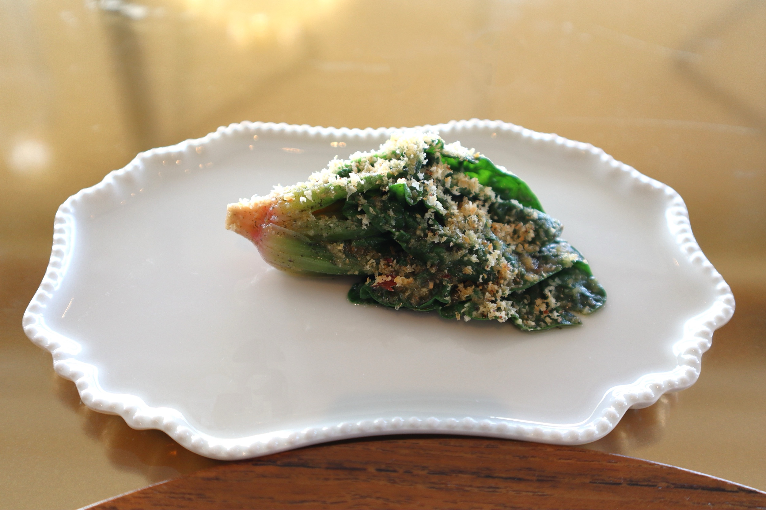 Spinaci con condimento di alghe e nocciola in accompagnamento al piccione