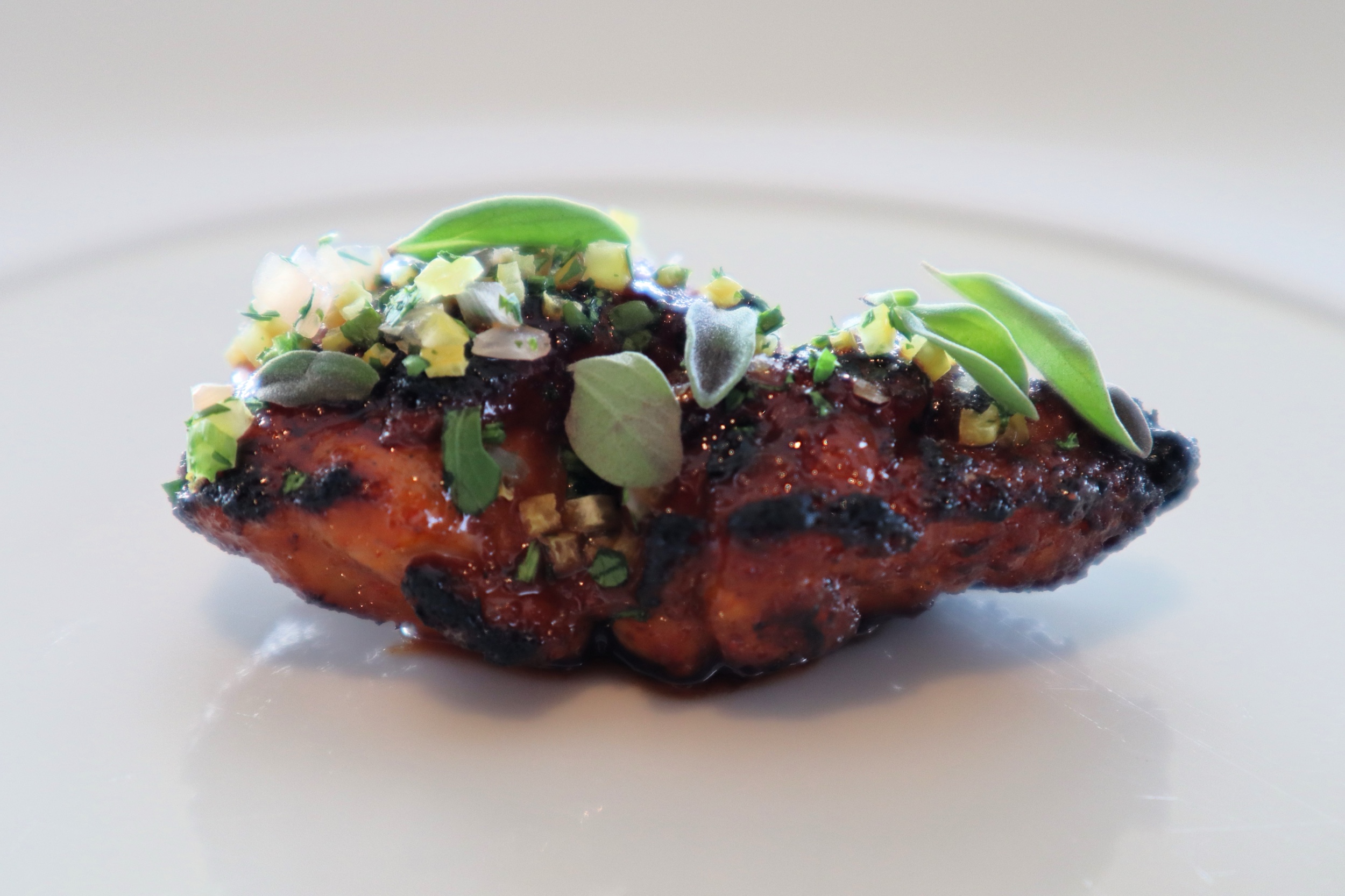 Animella laccata alla brace, gastrique al peperone di Altino, miele, gremolada, crème fraîche, olio al cipollotto e “piadina naan” alla brace. Con il consiglio di farne un panino si vola!