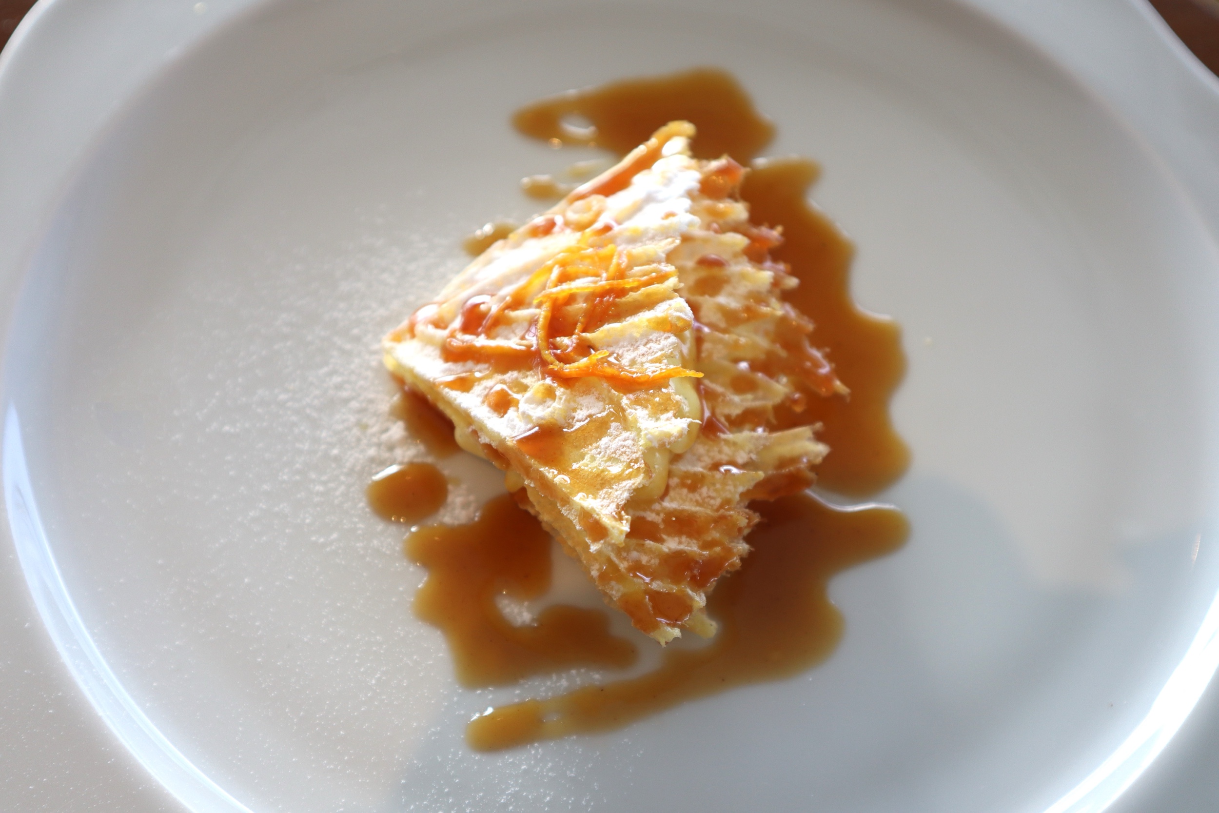 Neola alla suzette, crema pasticcera, marmellata di arancia amara, fondo di anatra al Grand Marnier. Che bontà!