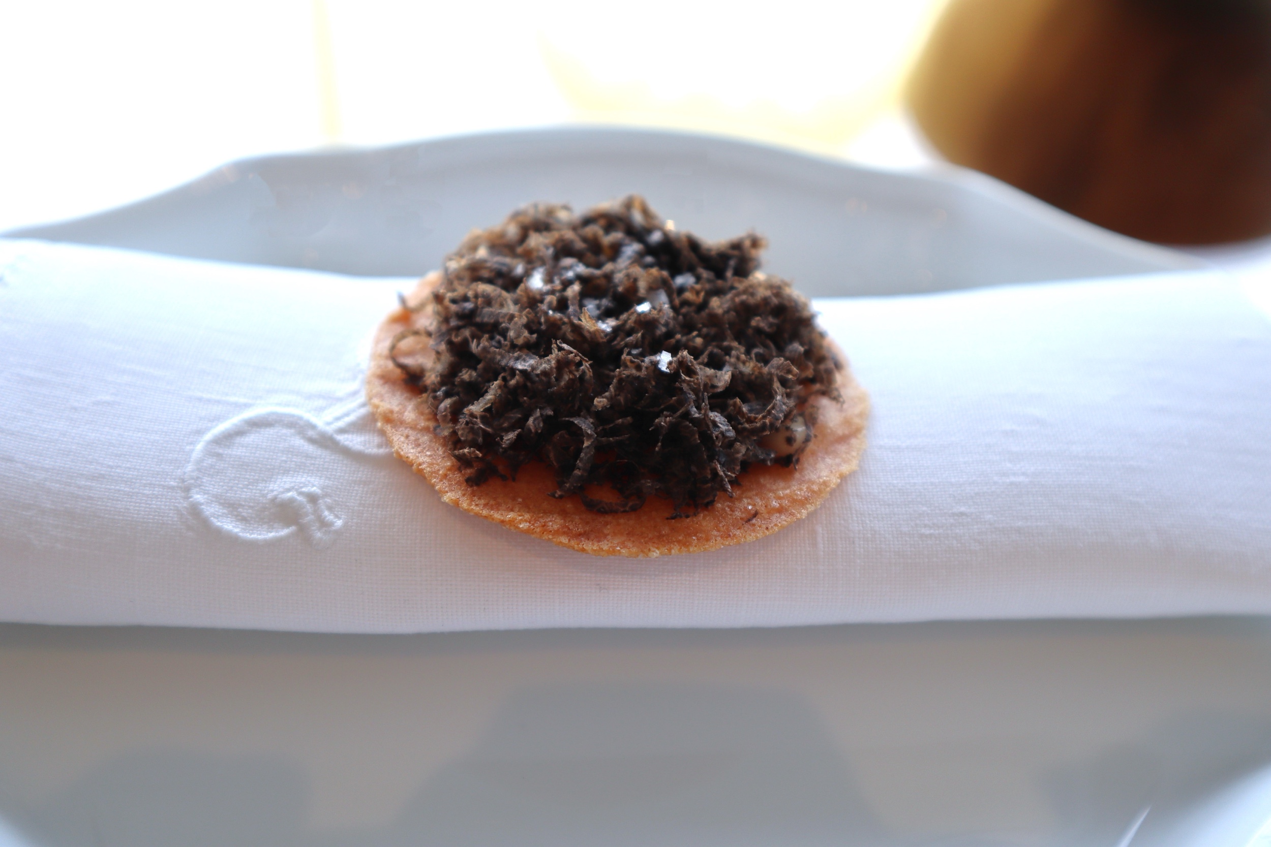 Chips croccante, crema di mandorla, crema di cipolla, tartufo nero