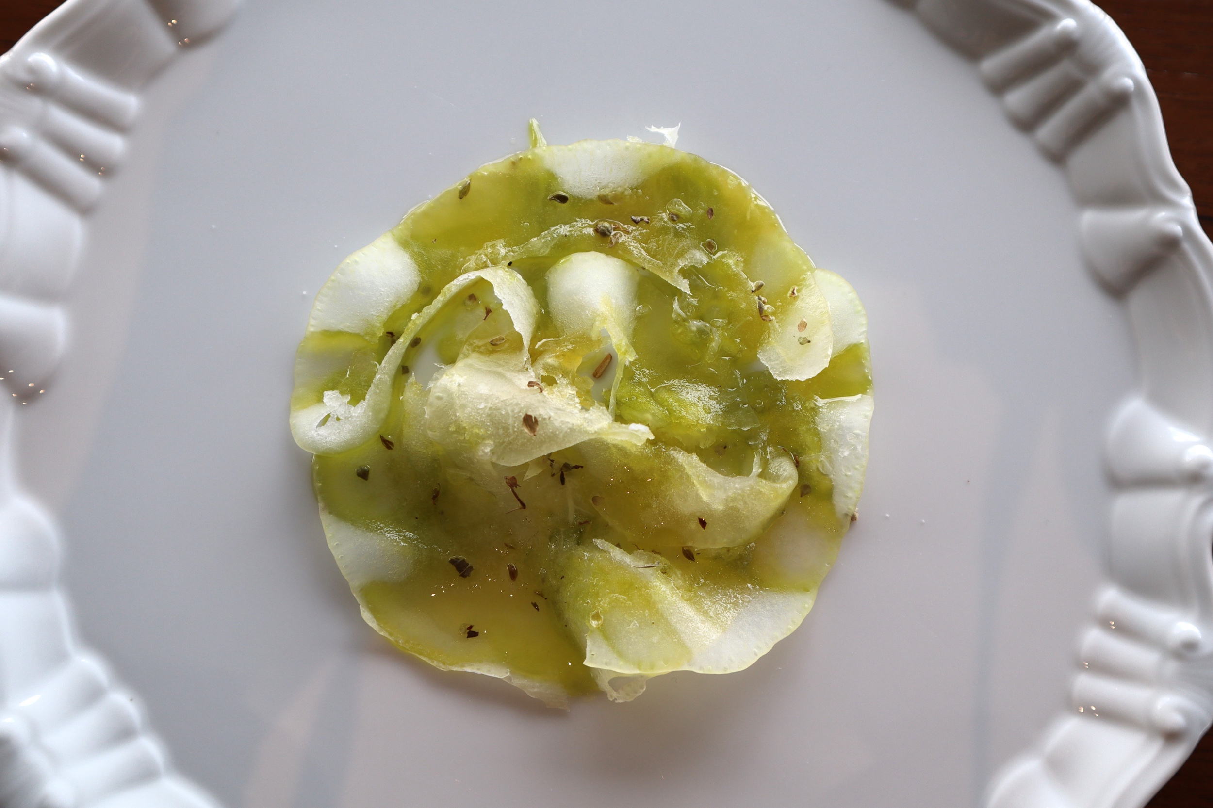 Daino in dolceforte, radicchio, vermouth e pompelmo. Carpaccio di daino marinato al ginepro, salsa dolceforte come velluto e un radicchio così buono che potrebbe benissimo esistere da solo