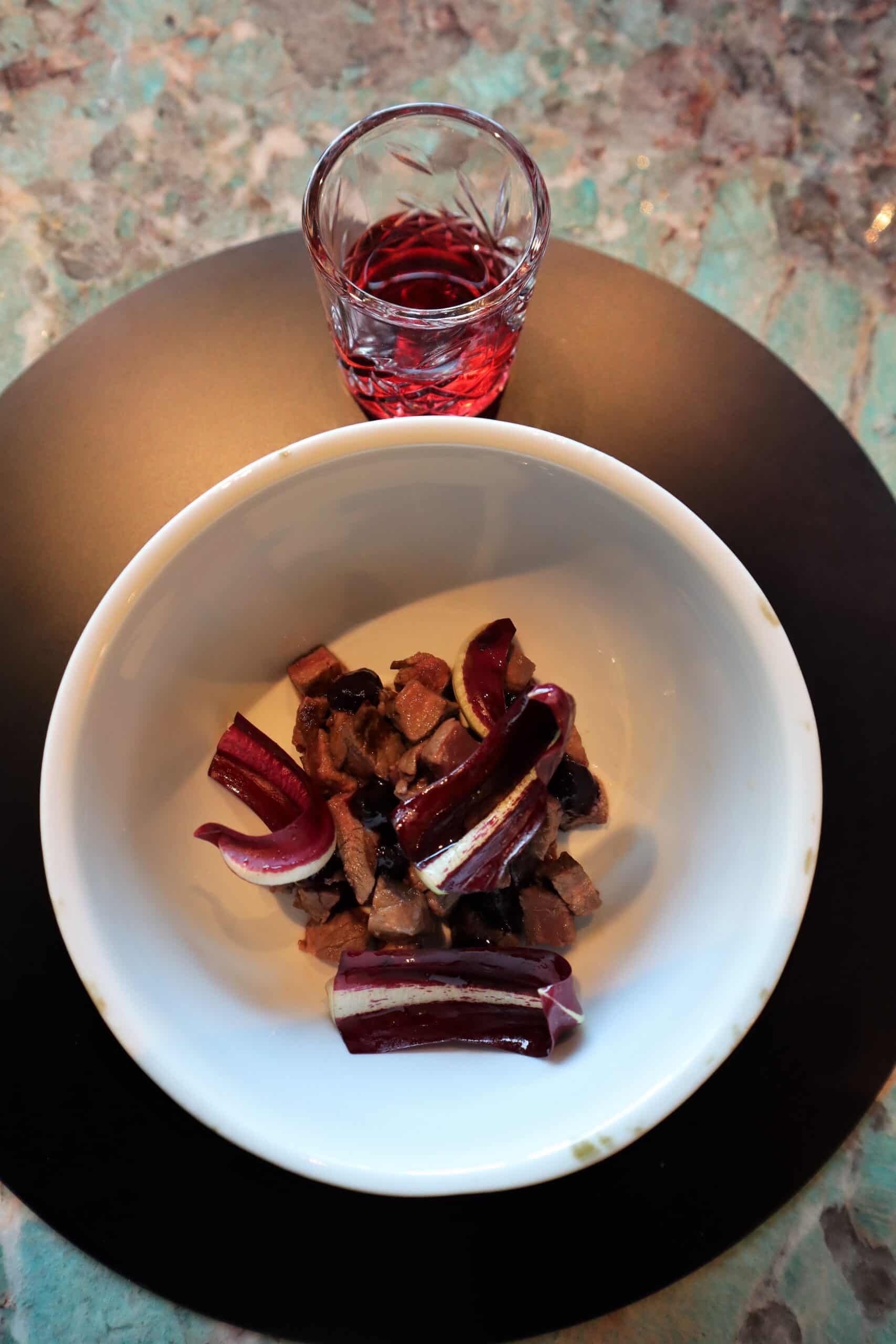 Capriolo, radicchio e genziana. A completare un drink al prugnolo (forse un po’ troppo dolce per me). Ho sempre timore quando sento la parola genziana; la sua componente amara non è per nulla facile da equilibrare, ma qui, usandola solo per l’affumicatura, rimane un sentore volatile, leggero. Capriolo puro, tenero e delicato.