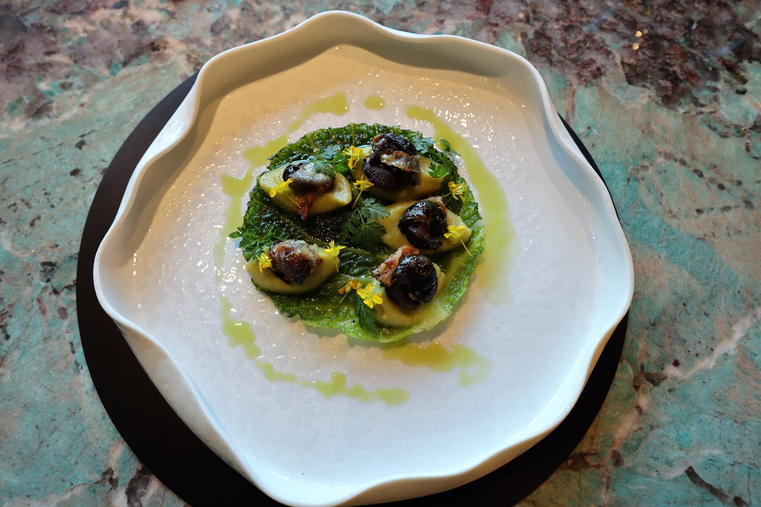 Spiedo di lumache, guanciale di Amatrice, taco di verza. Ecco l’anima bresciana della chef che dedica un piatto alle lumache di vigna, molto più delicate e che lasciano quindi maggior spazio alla verza, sia in crema che in foglia. Buonissime!