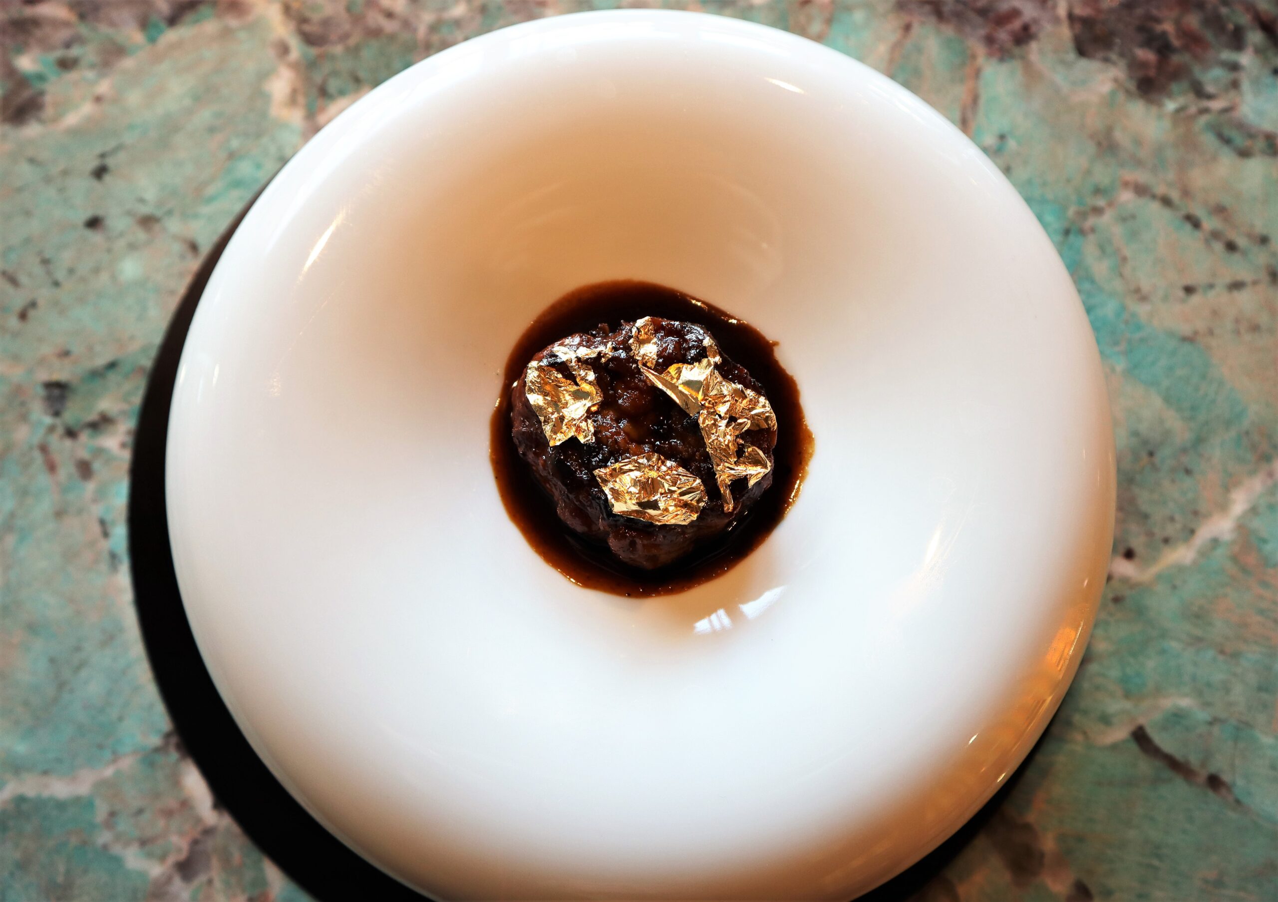 Saint honoré, ceviche di storione, crema di storione e caviale Oscietra di Calvisano. Wow! Veramente un piatto piacevolissimo in cui si apprezza la nota agrumata del limone, la sfoglia croccante dell’impasto e la scioglievolezza del ceviche di storione.