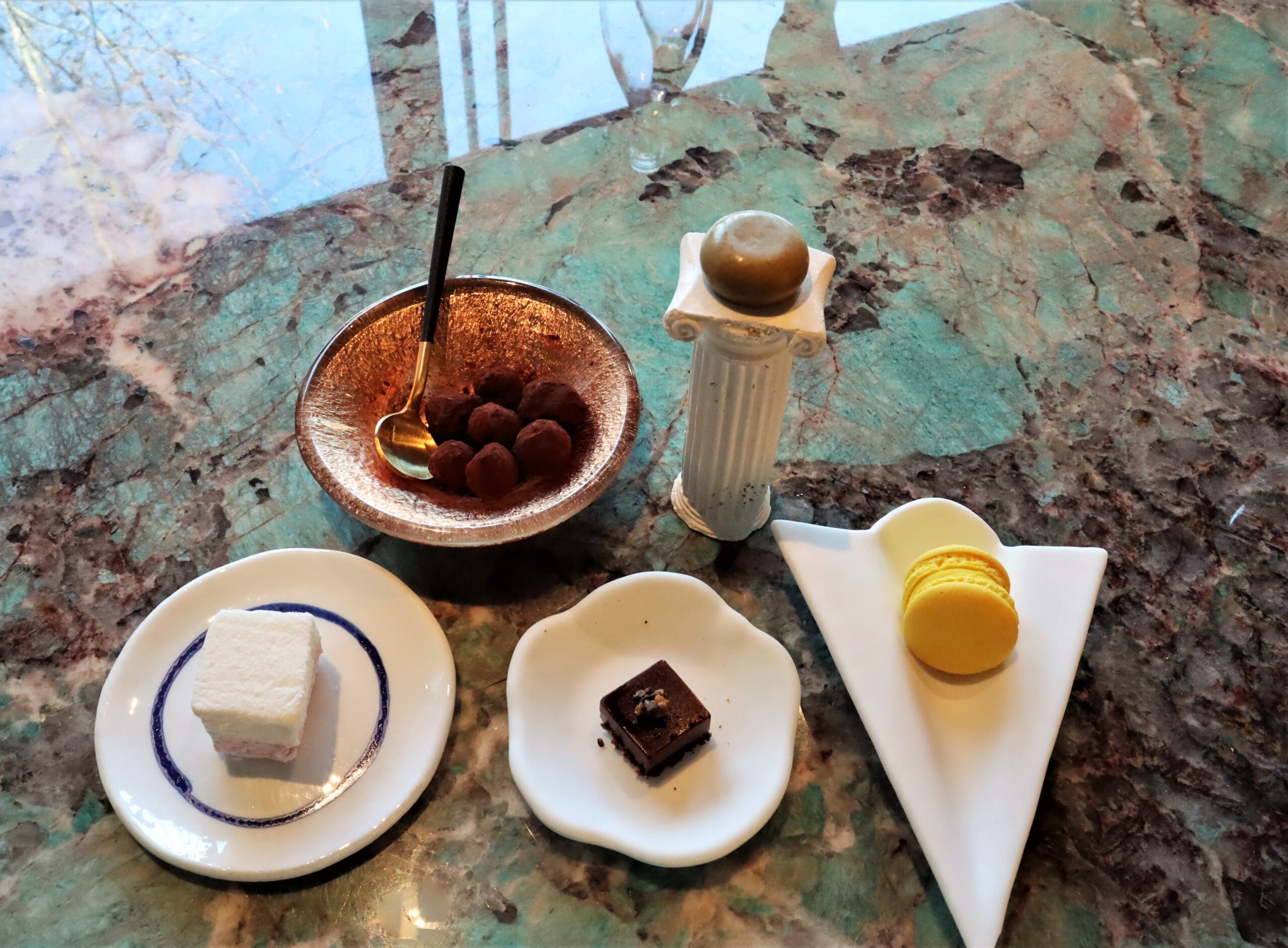 Piccola pasticceria: Macaron al passion fruit – Cremino al pistacchio – Cioccolatino al lampone – Marshmallow cocco e lampone – Nocciole tostate e sabbiate al cacao