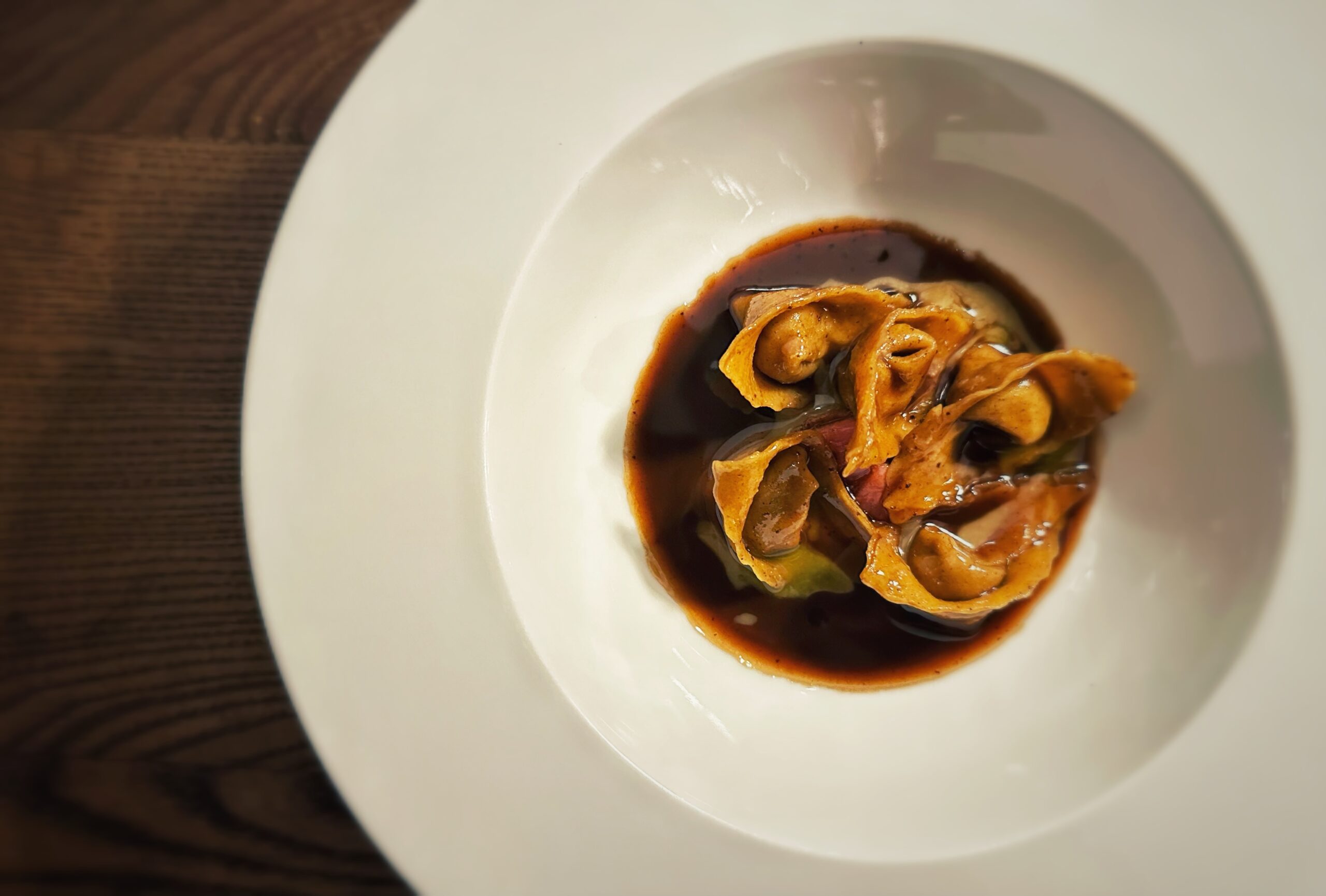 Tortello di cinghiale in dolceforte, rabarbaro, burro ai pinoli tostati, alloro