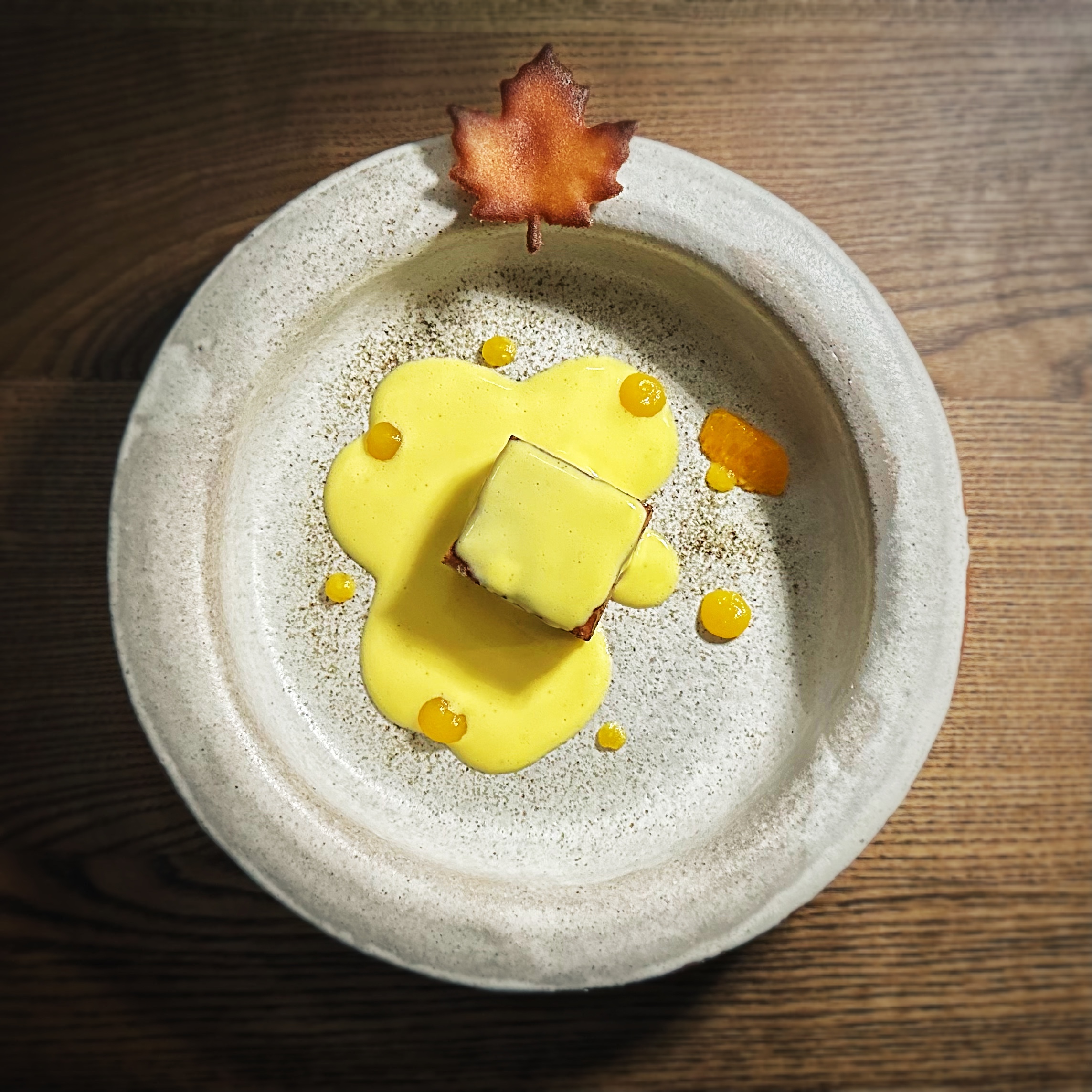 Cake alle castagne e rosmarino, crema inglese alla vaniglia e mandarino