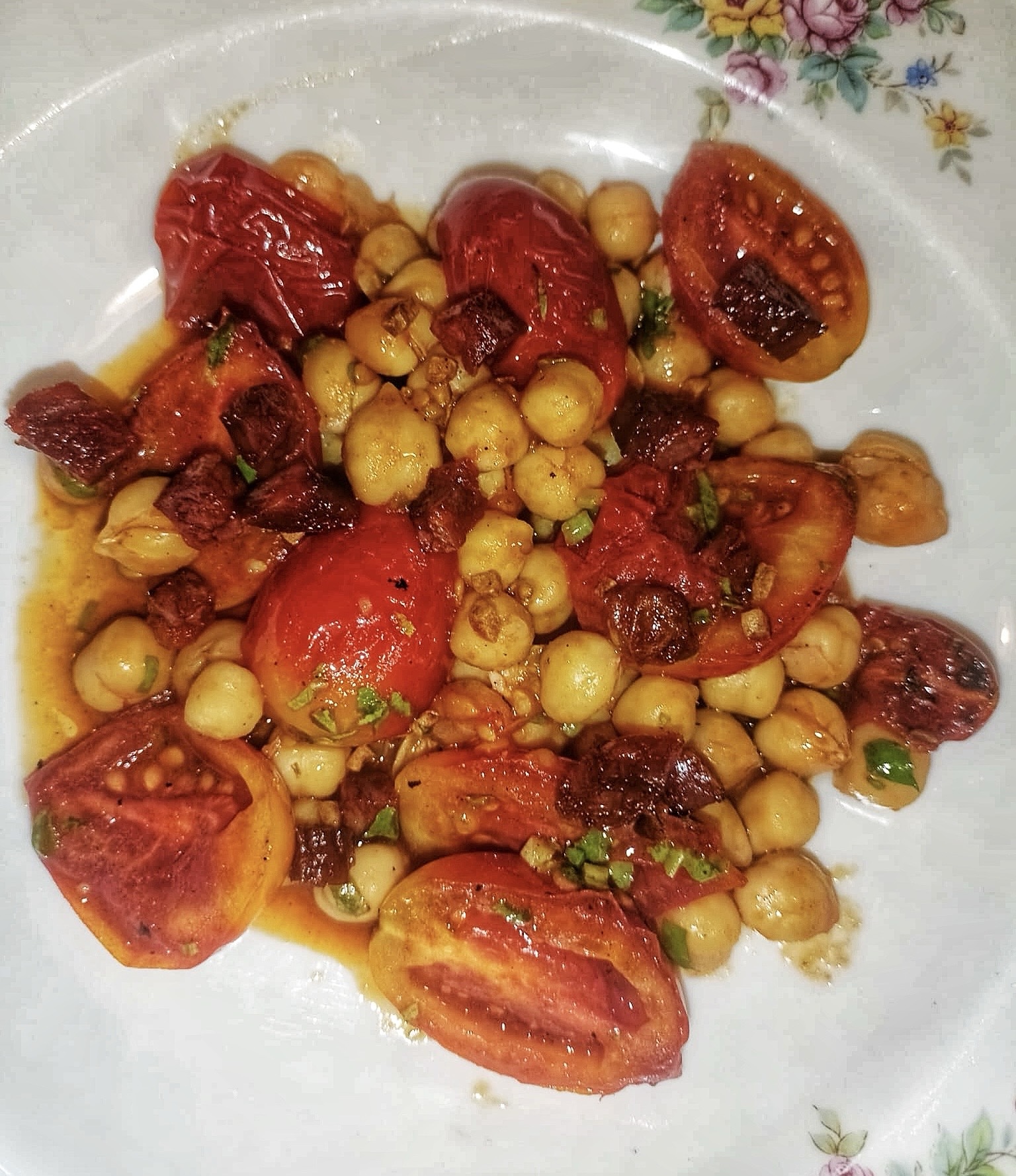 Insalata di ceci, gli ultimi pomodorini della stagione, chorizo della vicina fattoria Valle Magica (la creatura ideata dall’irlandese Ralph Boston, dove è vivamente consigliata la visita, per grandi e piccini, non lontano dalla spettacolare Rocca Calascio, per intenderci)