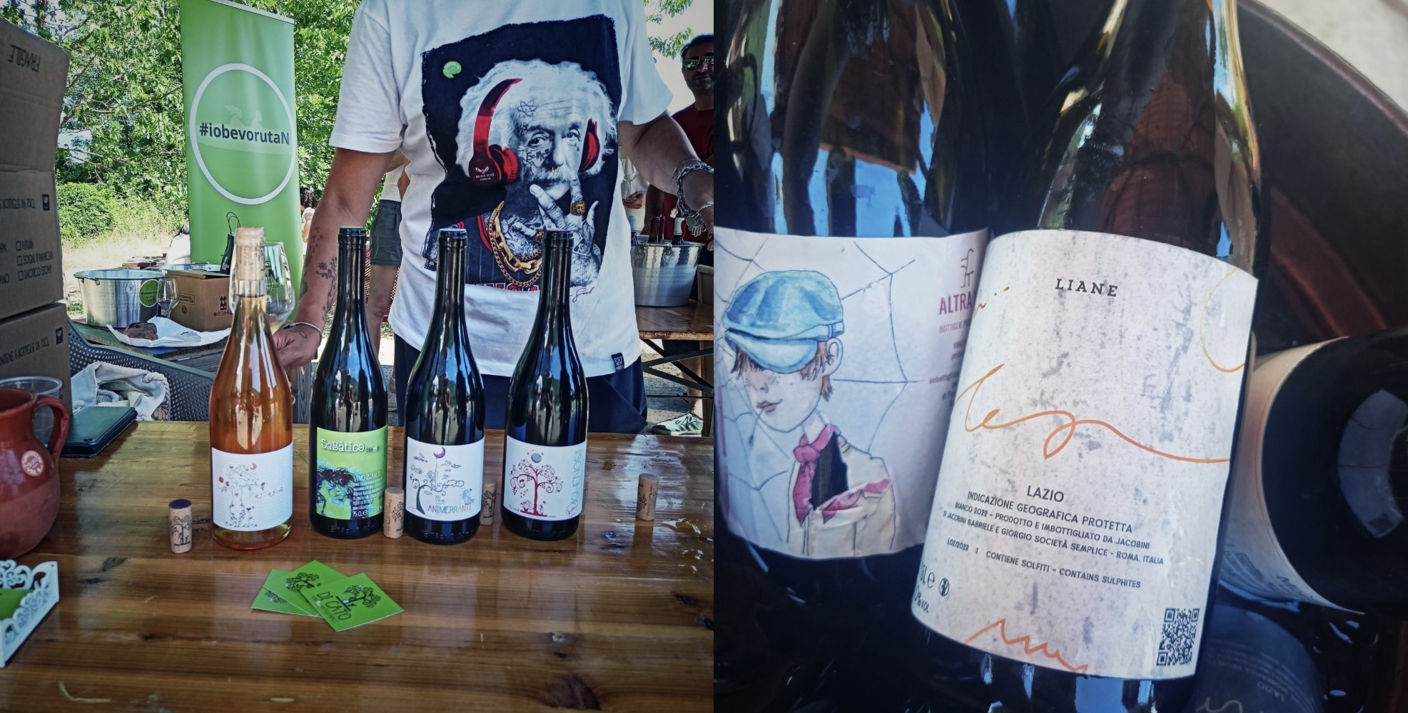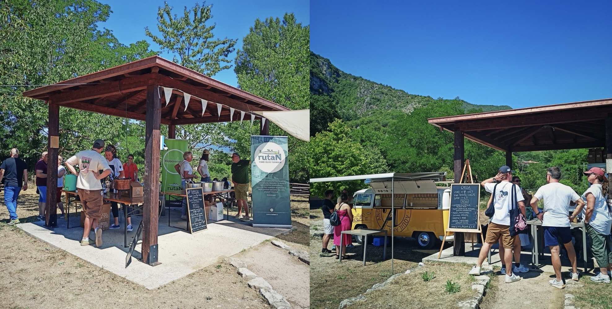 P.S. Inoltre, ti potrebbe interessare anche il loro nuovo progetto nato da maggio 2024 grazie ad un’altra intuizione di Claire: Rurale, un mercato contadino che coinvolge mensilmente agricoltori, viticoltori, pastori, fornai… del territorio sempre diversi. Se l’obiettivo è quello di facilitare l’incontro tra produttori e consumatori, per noi si è rivelata l’occasione giusta per darsi appuntamento con alcuni amici. Dove? Rurale si tiene sempre a Stiffe, nella grande area picnic dell’Enoteca Casale Liberati: basta seguire i cartelli scritti a pennarello blu! Però non aspettarti un mercato convenzionale… Perché? Perché qui si mangia e si beve alla grande: ai fuochi ci sono il solito Dan, ma anche Maicol e la sua brigata dell’Osteria dei Maltagliati di Torano Nuovo (TE). Claire invece si divide tra i tavoli e la cucina, supervisionando il tutto. Di sottofondo dalle casse esce musica tutto il giorno e nascosto all’ombra degli alberi, c’è poi un originale Volkswagen giallo ambra e bianco, nonché birreria itinerante di Anbra (Anonima Brasseria Aquilana), il primo microbirrificio nato all’Aquila. Beh, il mercato è aperto solo la mattina, dalle 9.30 alle 12.30, e, se vuoi un consiglio, cerca di arrivare per l’apertura siccome, essendo tutte piccole produzioni artigianali, le cose più sfiziose vanno subito a ruba. Qualche esempio? I formaggi de La Capra Fenice, le farine e i legumi di Simone De Donatis, pane e biscotti di Serena Tornusciolo… L’orario per “pranzare” è invece dalle 11,00 alle 17,00. Per quanto riguarda il vino, puoi scegliere di andare al calice o di acquistare una degustazione completa. In entrambi i casi ti rilasceranno dei token da consegnare ai vari banchetti. Ecco, secondo te quale soluzione abbiamo scelto? Esatto, ormai ci conosci… Finalmente abbiamo conosciuto di persona Maria Paola di Cato dell’omonima azienda di Vittorio (AQ), ma anche fatto due belle scoperte dalle regioni limitrofe: Liane dei fratelli Gabriele e Giorgio Jacobini dai Castelli Romani e Altra Via di Paolo Roberto Manso da Bevagna (PG). E poi ci siamo persi con  Marco Palantrani di Rutan (hai provato a leggerlo al contrario?), distribuzione di vini e oli buoni, in una successione di assaggi che non finiva più. Il cibo? Per il cibo potrai scegliere di accomodarti su uno dei tanti tavoli in legno presenti o, se preferisci, portarti dei teli per un bel picnic sul prato. Non si effettua servizio al tavolo, verrai chiamato quando il tuo ordine sarà pronto. Dobbiamo ammettere che le aspettative, tenuto conto della combo in cucina, erano altissime. Tuttavia, sono riusciti a stupirci, in particolare con la costina di maiale brasata in salsa BBQ – una carne così tenera non l’avevamo ancora mangiata – e con un’incredibile fetta di cocomero alla brace, inaspettatamente condita come una bistecca e servita con della melassa di mela a mo’ di ghiacciolo. In soldoni, è un evento per tutti, grandi e piccini (ovviamente gli amici a quattro zampe sono i benvenuti), che ci sentiamo proprio di consigliarti, dove il tempo vola e la festa non finisce mai. Una volta al mese però!
