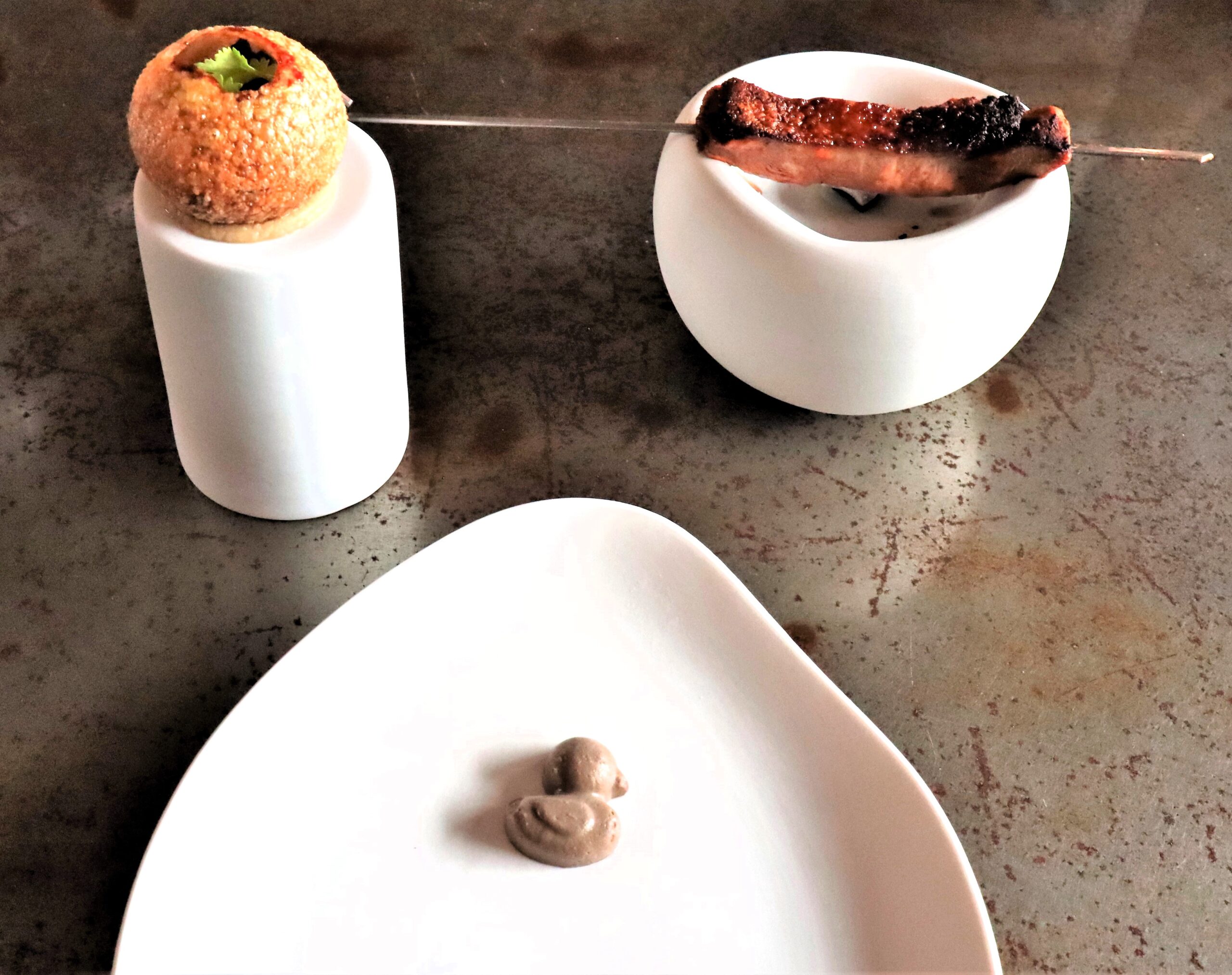 Tandoori. Anatra, ciliegie e quinto quarto. Petto d’anatra marinato in yogurt e spezie tandoori, servito con il suo quinto quarto e accompagnato da un panipuri croccante (una specie di bignè indiano preparato con farina di mais e ceci) farcito con salsa piccante, latte di mandorla e ciliegie in conserva. Ottimo tutto, la carne gustosa che sa di brace, la croccantezza del panipuri e “l’anatroccolo” realizzato con il quinto quarto, un finale intenso nelle giuste dimensioni per poterlo meglio apprezzare
