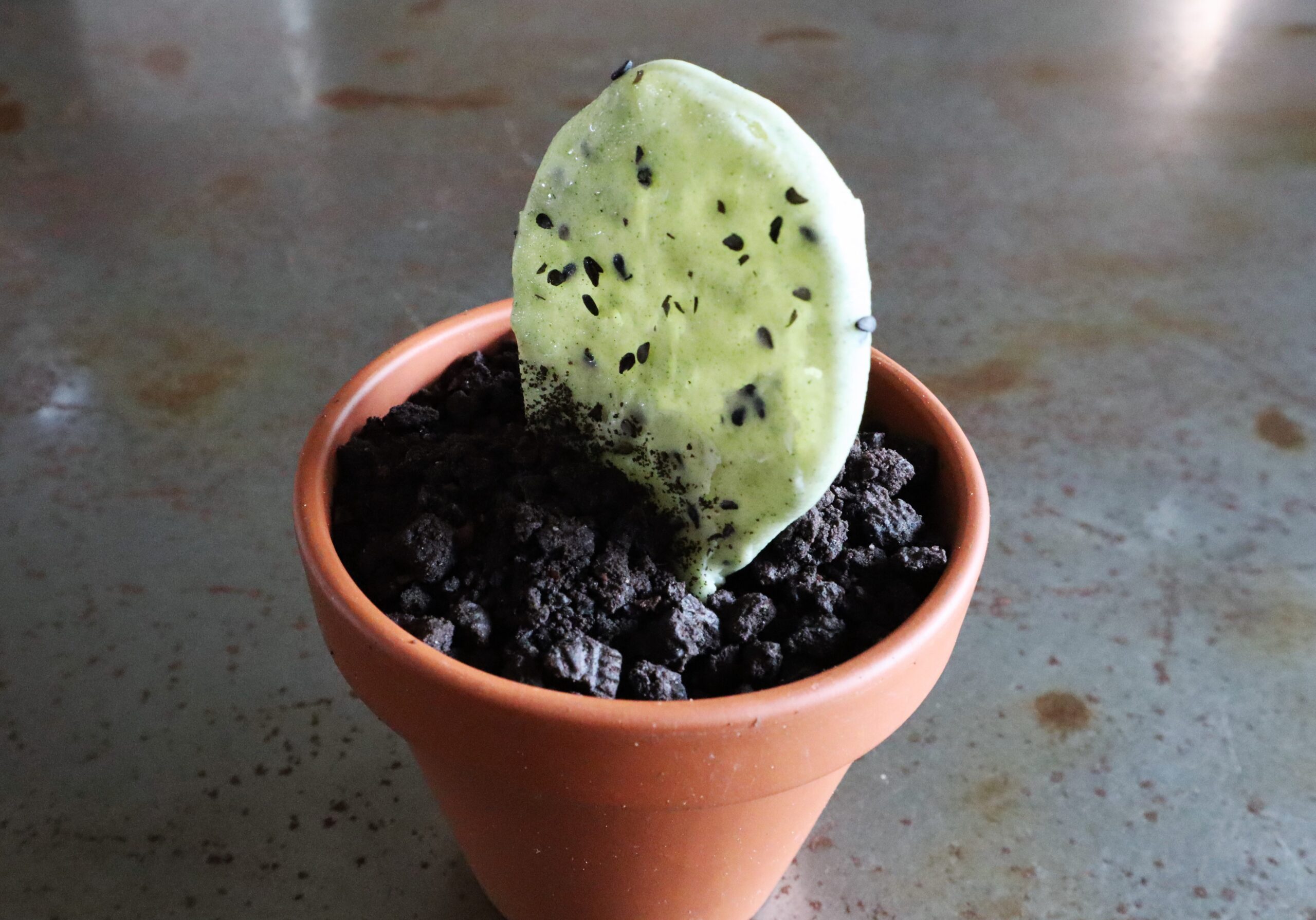 Il predessert ricorda il mitico After Eight ed è una paletta di fico d’india con all’esterno del cioccolato bianco. Ops il cioccolato si sta sciogliendo, non è molto pratico, ora mi scivola tra le dita!