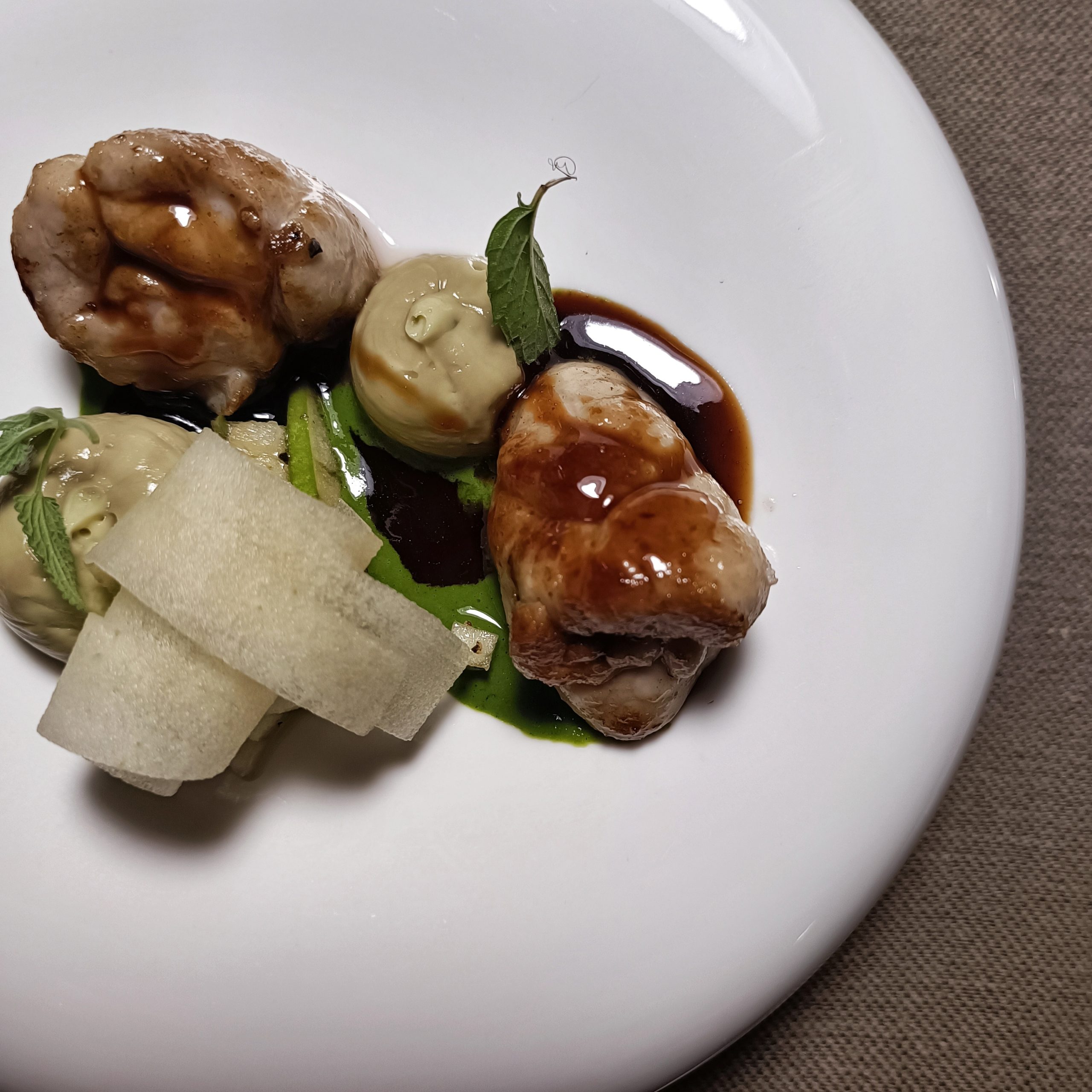 A contendersi il “premio” è stata L’anatra. Qui la cottura del petto ha fatto la differenza: pelle croccante, carne succosa e tenera. Una delizia per il palato arricchita dalla spinta donata dal suo fondo. Notevole anche la terrina, fatta con la coscia, ma per quanto mi riguarda la scena se l’era già presa interamente il petto.