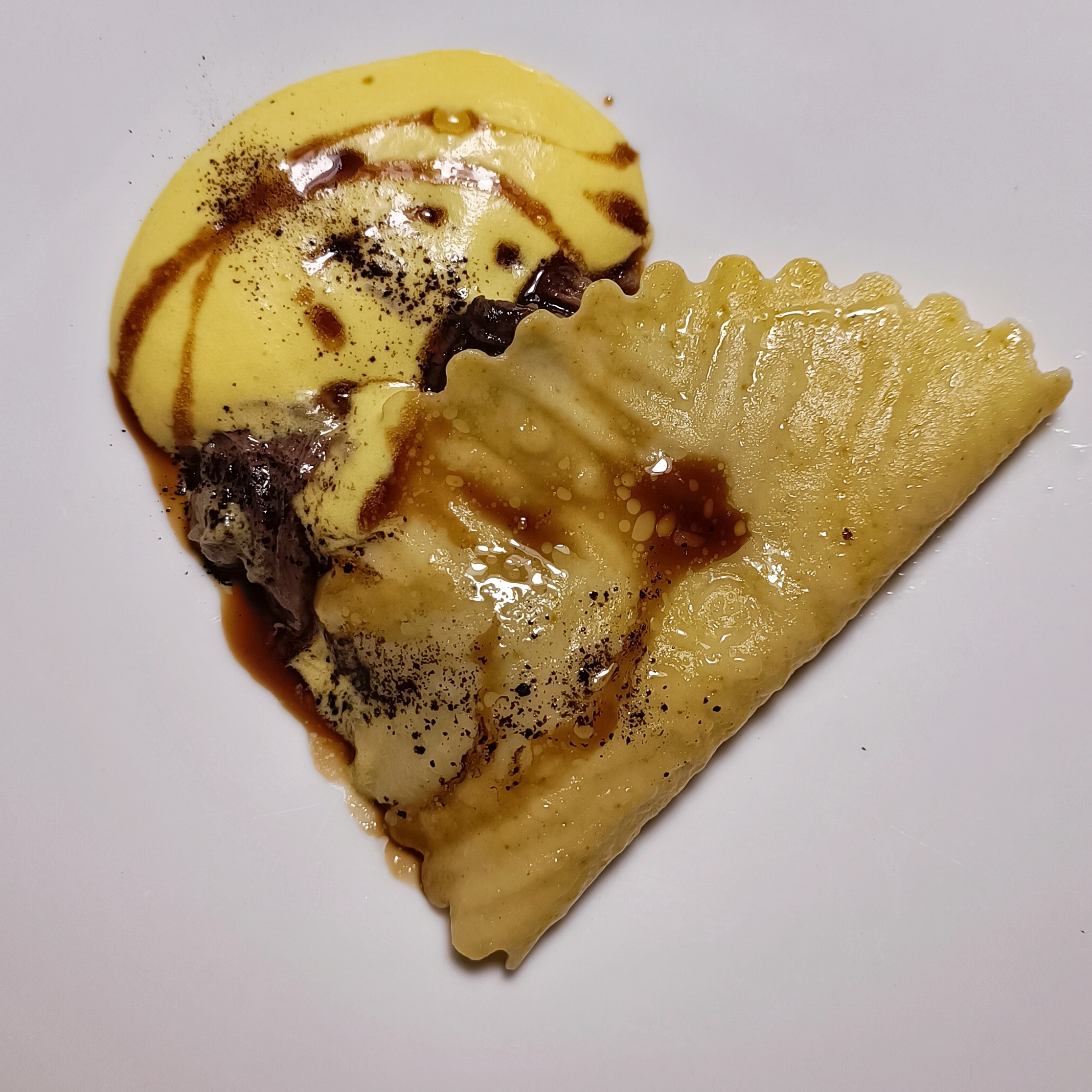 Pintadera: raviolo aperto, pecora, zafferano e liquirizia