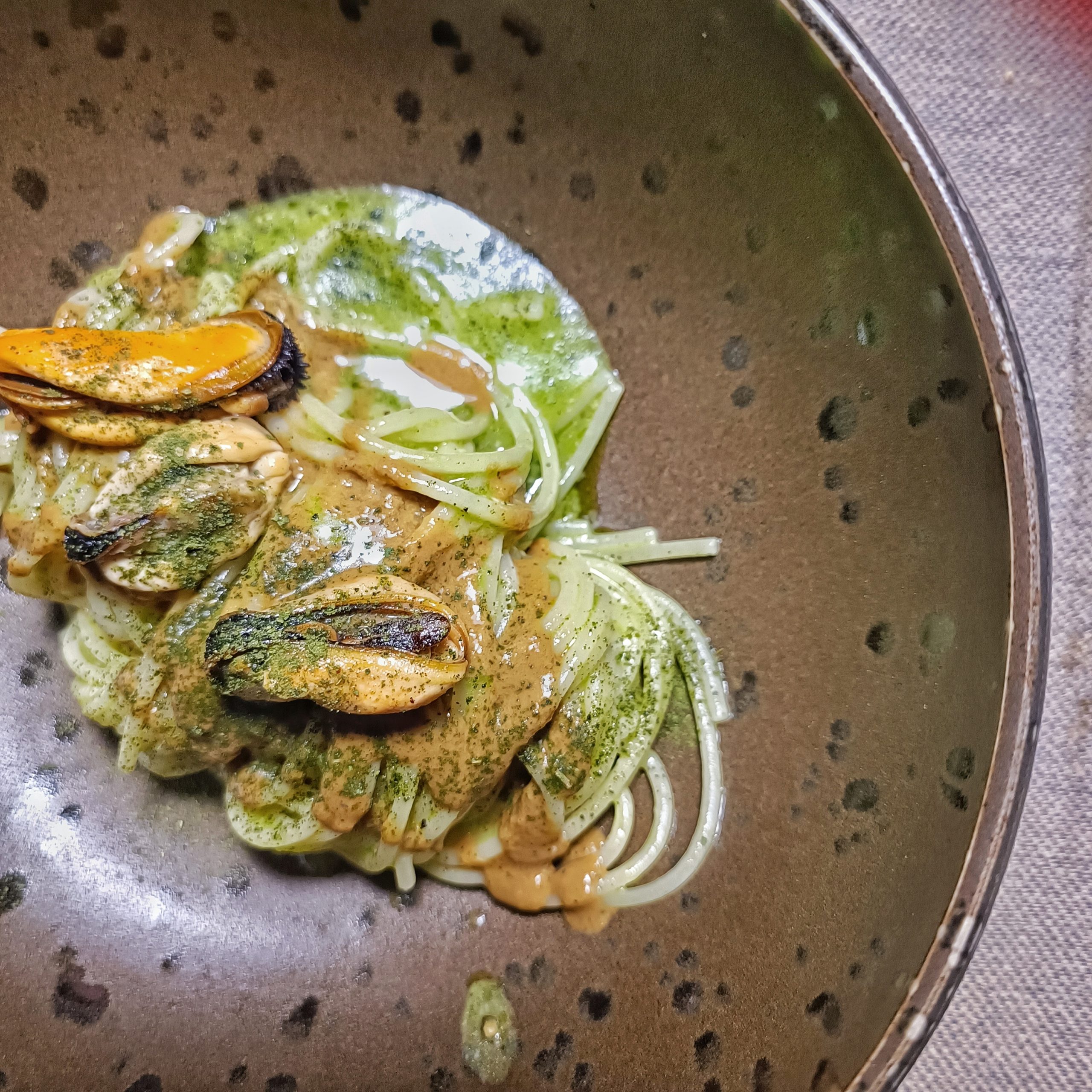 Spaghettino, estratto della foglia di fico, fiore sardo ed emulsione di cozze