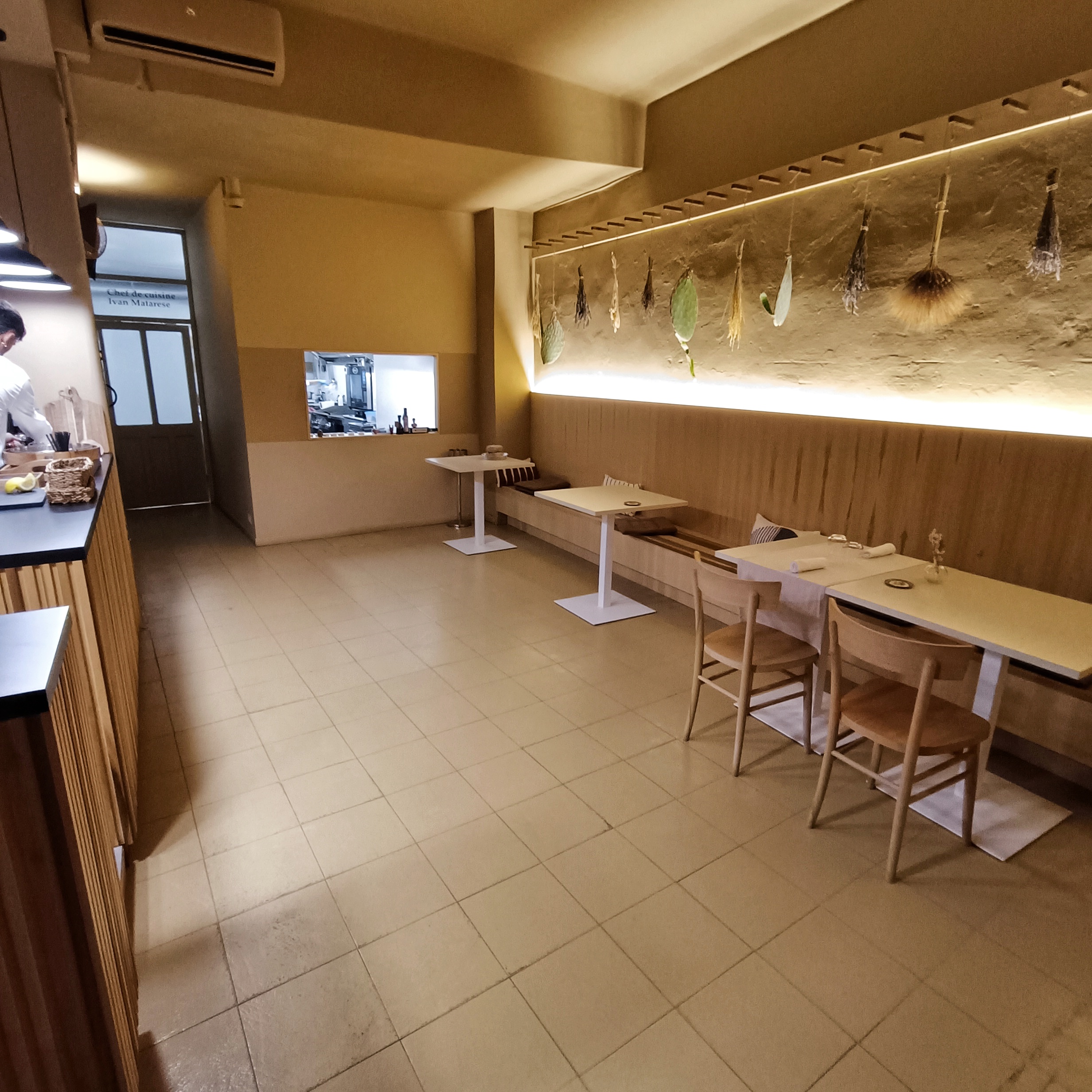 Beh, era l’ultimo weekend di settembre, il Maestrale soffiava forte e l’aria era particolarmente fresca. L’atmosfera, però, è cambiata non appena abbiamo varcato la soglia del ristorante, grazie anche alla calorosa accoglienza del personale. Il locale si sviluppa in due ampie sale: la prima, vicino all’ingresso, è caratterizzata da un’elegante panca circondata da una manciata di tavoli e da un bancone affacciato sulla cucina, dove avrei voluto accomodarmi per godere dello spettacolo dei cuochi ai fornelli. L’uso massiccio del legno rende gli interni caldi e accoglienti, mentre l’arredamento moderno, arricchito da diversi richiami alla tradizione locale, conferisce agli stessi un’eleganza davvero unica.