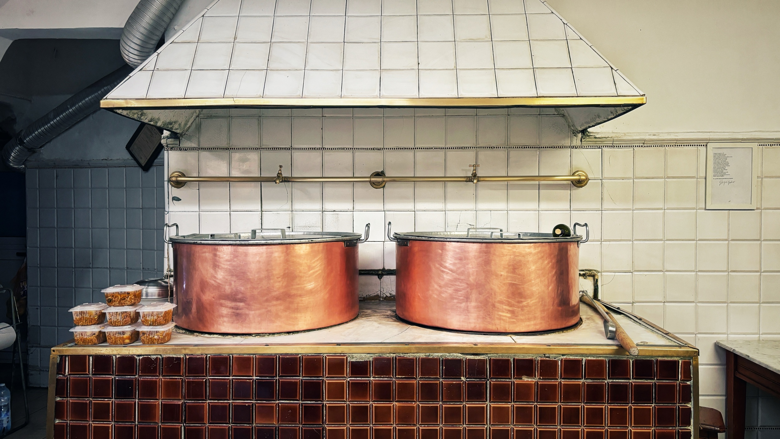 Mentre parla si appoggia all’antico ronfò ottocentesco fasciato da piccole maioliche marroni, sulla cappa sono appoggiati i pentoloni di rame. Il pavimento alla genovese, il bancone in marmo, i tavoli di legno e marmo mi ricordano che la tripperia è stata inserita nel circuito delle botteghe storiche della città, grazie agli arredi, ai vecchi documenti e agli elementi architettonici molto ben conservati.