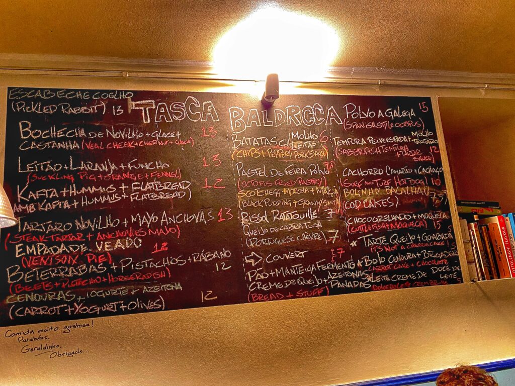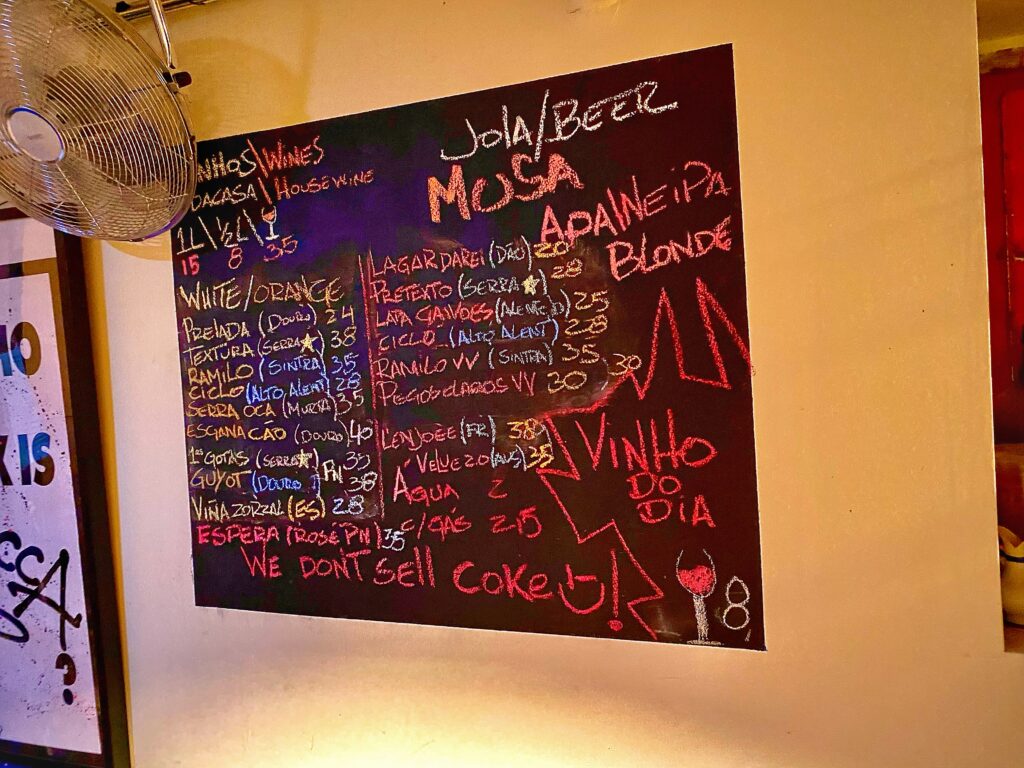 Il locale è rumoroso, il personale informale e un po’ burbero, i muri più che dipinti oserei dire scarabocchiati, i piatti sbeccati, l’atmosfera giovane e festosa; il tutto condito dallo chef-anfitrione Pedro Monteiro che gira tra i tavoli scherzando e soffermandosi sovente con amici o clienti a bersi un (anche tre o quattro) bicchiere di vino.