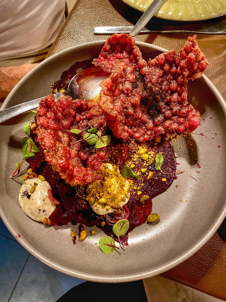 Iniziamo con un’opzione vegetariana di livello: barbabietola, pistacchio e rafano.