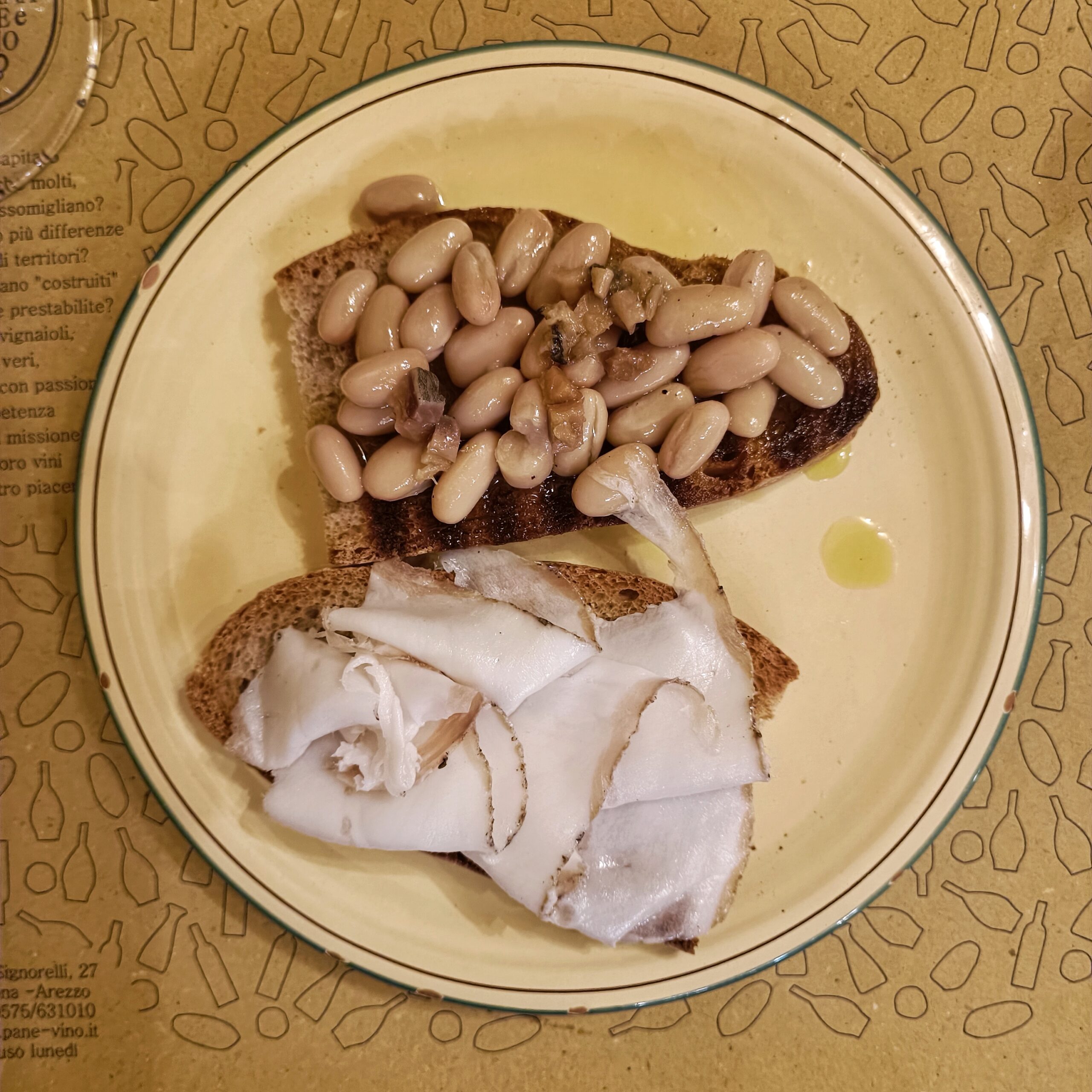Bruschetta con lardo di Colonnata e bruschetta con fagioli e aringa affumicata