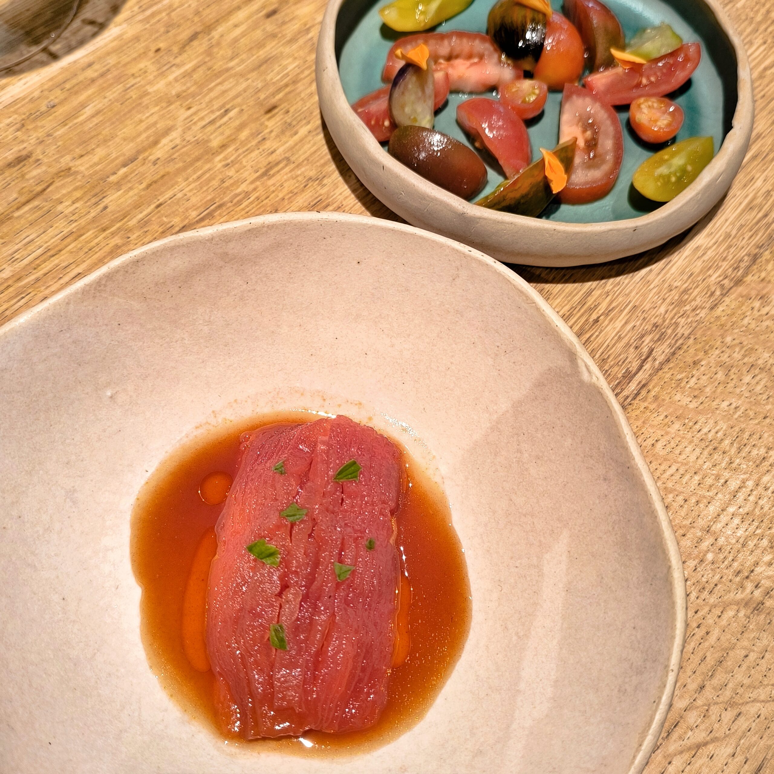 Il primo sussulto l’ho avuto con il piatto a base di diverse varietà di pomodoro: freschezza e complessità fuse in un piatto estivo e rinfrescante. Dopo una giornata bollente tra i canali di Burano, l’ho apprezzato ancora di più. Poi gli gnocchi, leggerissimi, con la complessità delle frattaglie e la note verde del sedano. Subito dopo, la portata a base di pane e foglie d’insalata: un’esplosione di sapori, sempre in equilibrio, ricca di sfumature che mi hanno lasciato senza fiato.